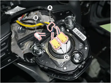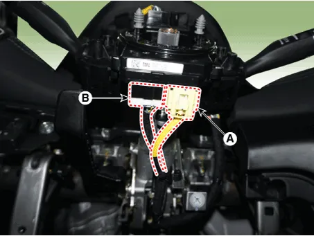 Disconnect the clock spring (A) and horn connector (B), then remove