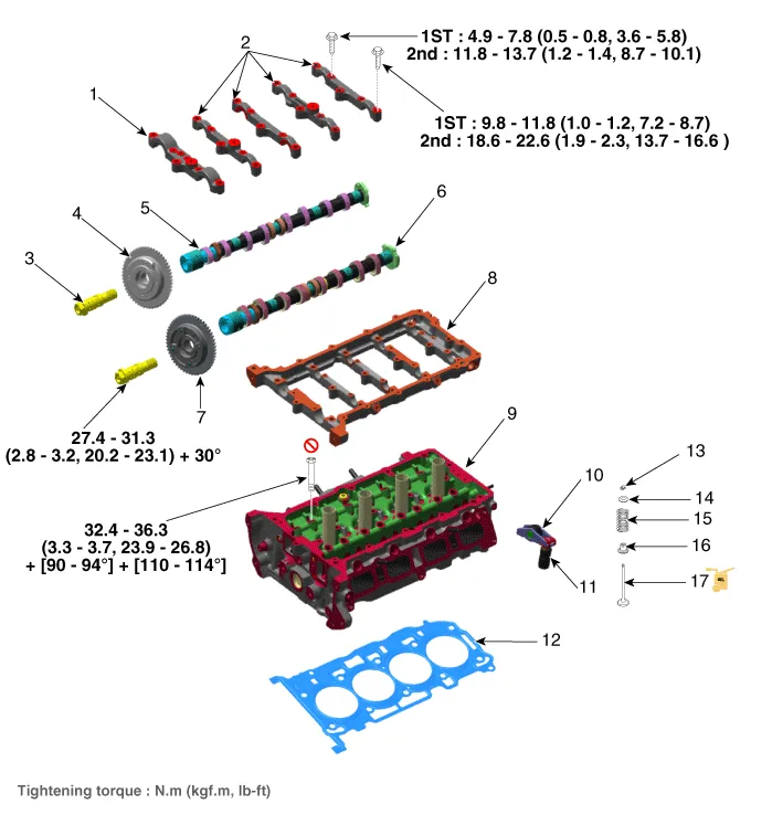 front bearing cap 2. Camshaft bearing cap 3. OCV & Center bolt 4. Exhaust CVVT assembly 5. Exhaust camshaft 6. Intake camshaft |