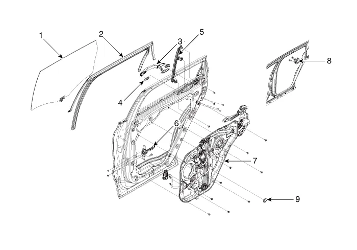 checker assembly 7. Rear door module assembly 8. Rear door striker 9. Rear door module plug hole |