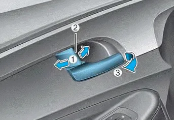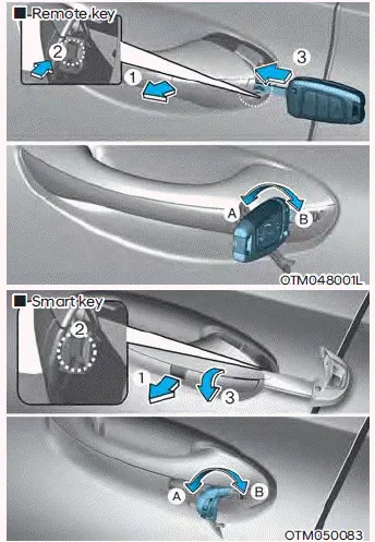 First, pull the outside door handle (1) and push the hook (2) located inside of outside door handle by using the mechanical key. And remove the cover (3).