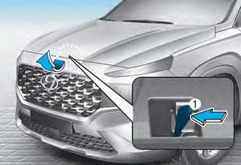 3. Go to the front of the vehicle, raise the hood slightly, push up the secondary latch (1) inside of the hood center and lift the hood.