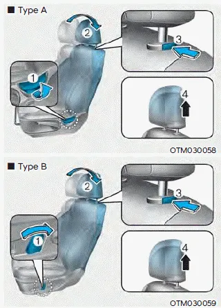 3. Press the head restraint release button (3) while pulling the head restraint up (4).