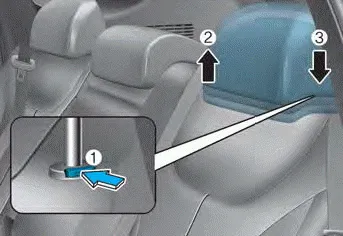 1. Put the head restraint poles into the holes (3) while pressing the release button (1).