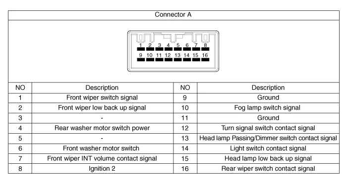 Wiper : 1.0A (Relay load) Washer : 4.0A (Motor load) |