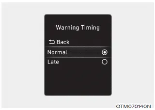 When the vehicle is first delivered, Warning Timing is set to ‘Normal’. If you change the Warning Timing, the warning time of other Driver Assistance systems may change.