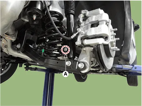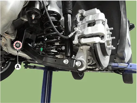 Loosen the nut holding the rear lower arm cam bolt (A).