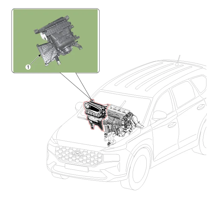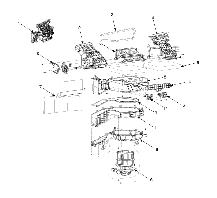 actuator 10. Air filter cover 11. Blower divider plate 12. Blower resistor (Manual) 13. Power mosfet (DATC) 14. Blower lower case 15. Blower lower cover 16. Blower motor assembly |