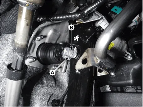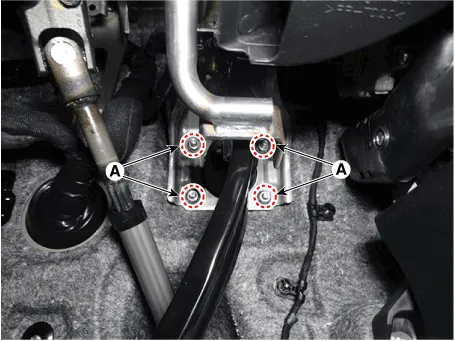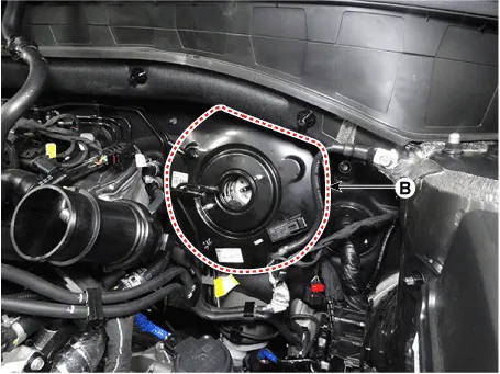 Remove the brake booster (B) after loosening the mounting nuts (A).