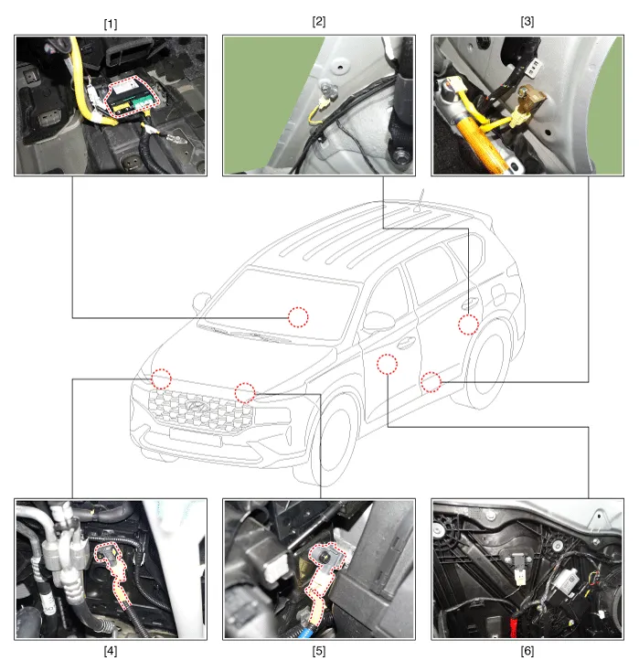 sensor (FIS) [RH] 5. Front impact sensor (FIS) [LH] 6. Pressure side impact sensor (P-SIS) |
