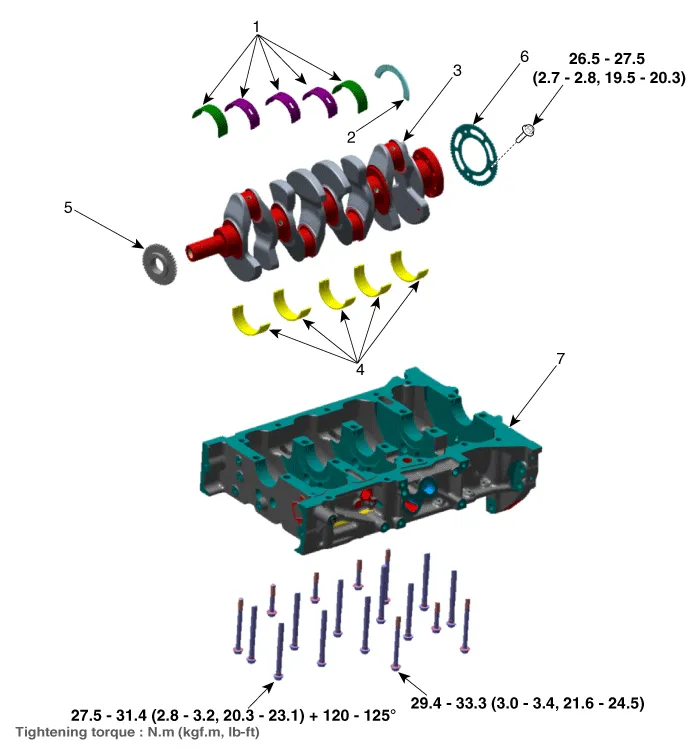 upper bearing 2. Thrust bearing 3. Crankshaft 4. Crankshaft lower bearing |