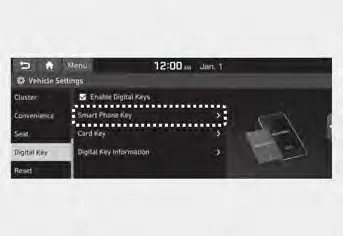 From the infotainment screen menu, go to [Setup] - [Vehicle] - [Digital Key] - [Smart