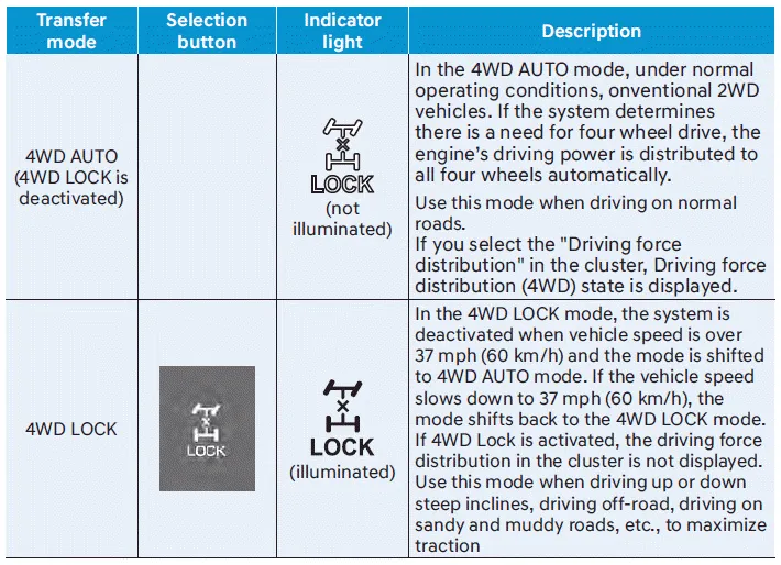 Auto Four Wheel Drive mode (normal driving) If the 4WD system determines there is a need for four wheel drive, the engine's driving power is distributed to all four wheels automatically.