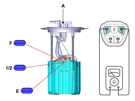 Removal 1. Remove the fuel pump. (Refer to Fuel System - "Fuel Pump") 2. Disconnect the fuel sender connector (A).
