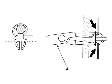 Slip pliers (A) under the clip base and through the hole at an angle,
