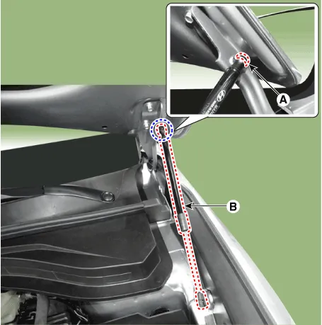 Replacement 1. Using a clip remover, remove the clips and then the hood insulator pad (A). • Be careful not to scratch the hood panel.