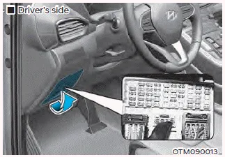 Blade fuse / Cartridge fuse 1. Turn the vehicle off. 2. Turn all other switches off. 3. Remove the fuse panel cover by pressing the tap and pulling up.