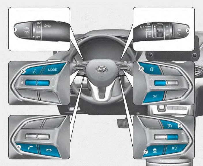 1. Inside door handle 2. Power window switches 3. Power window lock button/Electronic child safety lock button 4. Side view mirror folding button 5. Side view mirror control switch 6.