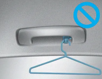 Do not hang other objects such as hangers or hard objects except clothes. Also, do not put heavy, sharp or breakable objects in the clothes pockets. In an accident or when the curtain air bag is inflated, it may cause vehicle damage or personal injury.