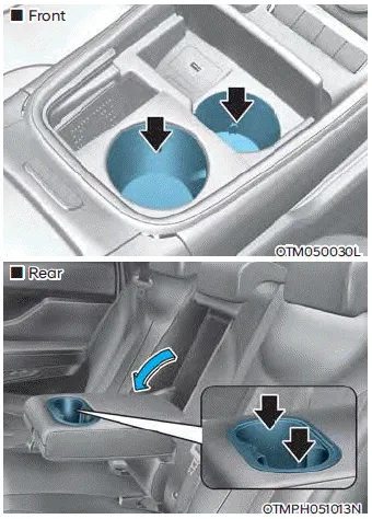 Cups or small beverages cups may be placed in the cup holders.