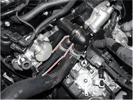 Disconnect the radiator lower hose (A) from inlet fitting.