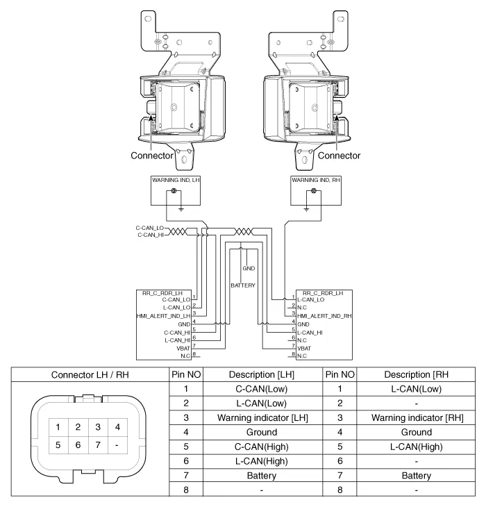 Specifications [BCW, BCA] Items Blind-Spot Collision Warning (BCW) Blind-Spot Collision- Avoidance Assist (BCA) Blind-Spot Collision- Avoidance Assist (BCA) ※Parallel Exit Rated voltage DC 12V Operating voltage 9V ~ 16V Operating speed 20 ㎞/h ~ 255 ㎞/h 60 ㎞/h ~ 200 ㎞/h 0 ㎞/h ~ 3 ㎞/h Sensible distance 70m 80m Frequency 24 GHz Numbers 2 EA [RCCW, RCCA] Items Rear Cross-Traffic Collision Warning System (RCCW) Rear Cross-Traffic Collision- Avoidance Assist (RCCA) Rated voltage DC 12V Operating voltage 9V ~ 16V Operating speed 0 km/h ~ 10 km/h 0.
