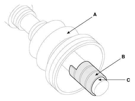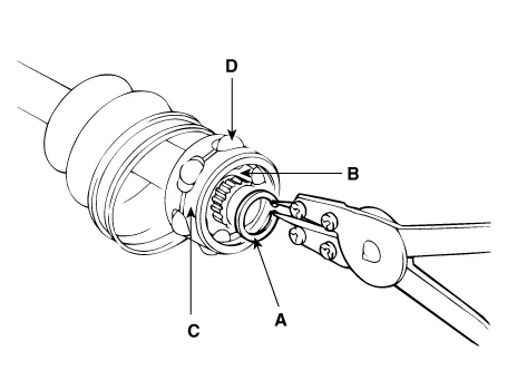 Remove the snap ring (A) and take out the inner race(B), cage(C) and