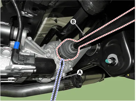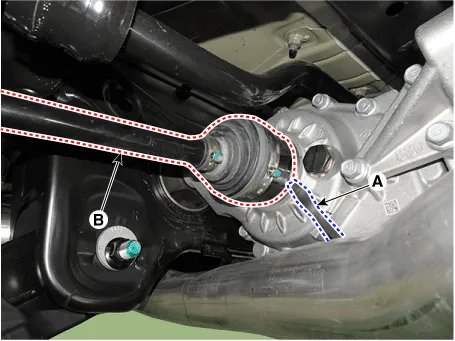 Remove the rear drive shaft (B) from the rear axle assembly (A).