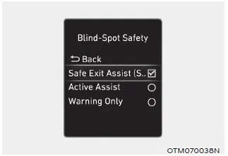 With the engine on, select ‘Driver Assistance → Blind-Spot Safety → Safe Exit Assist (SEA) (or SEA (Safe Exit Assist)’ from the Settings menu to turn on Safe Exit Assist and deselect to turn off the system.