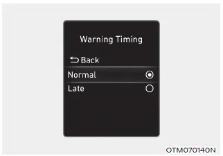 When the vehicle is first delivered, Warning Timing is set to ‘Normal’. If you change the Warning Timing, the warning time of other Driver Assistance systems may change.