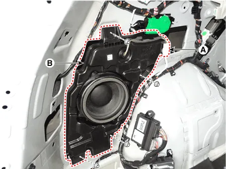 Remove the woofer speaker (B) after loosening the bolts and nuts.