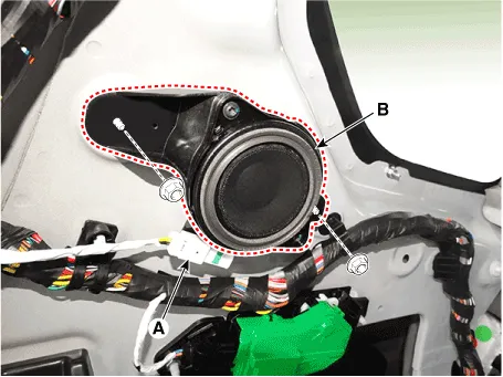 Remove the front door speaker (A) after loosening the screws.