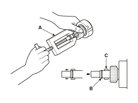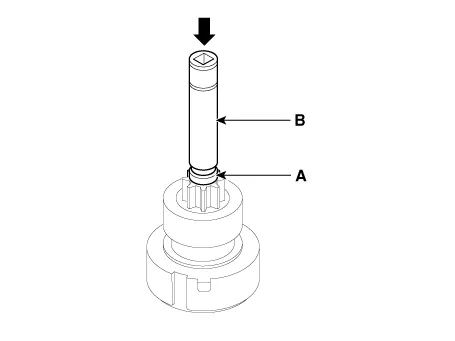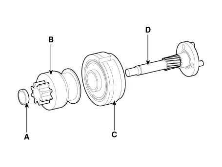 Remove the stopper (A), overrunning clutch (B), internal gear (C) and