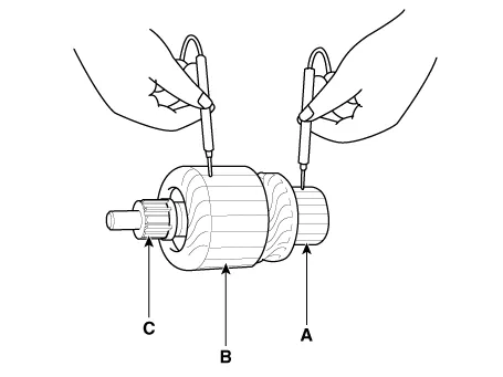 (-) plate (B). If there is continuity, replace the brush holder assembly.