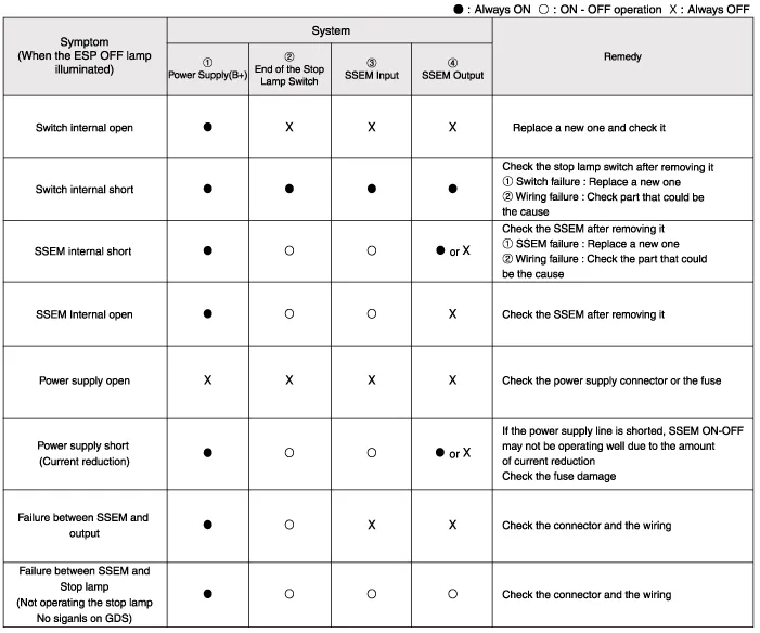 trouble, Stop lamp lighting trouble , ESP OFF light