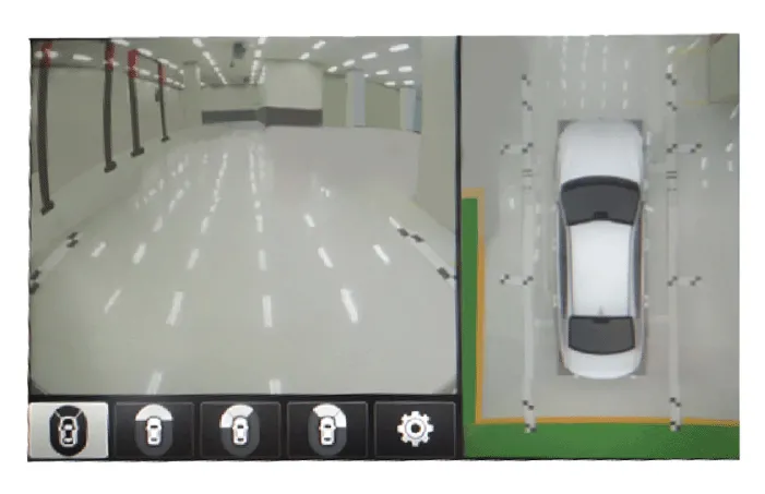 4 sides of the vehicle, on the Head Unit Screen. It shows 360 degrees sky-view