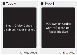 If this occurs the ‘Smart Cruise Control disabled. Radar blocked’ (or ‘SCC (Smart Cruise Control) disabled. Radar blocked’) warning message will appear for a certain period of time on the cluster.