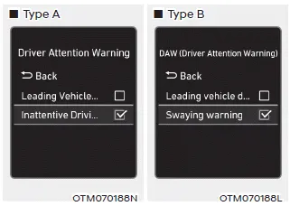 With the engine on, select ‘Driver Assistance → Driver Attention Warning (or DAW (Driver Attention Warning))’ from the Settings menu to set whether or not to use each function.