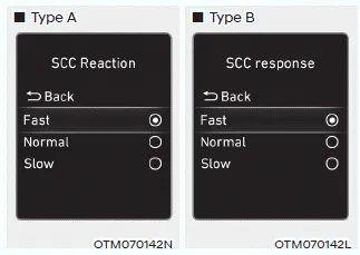 With the engine on, select ‘Driver Assistance → SCC Reaction (or SCC response)’ from the settings menu to select the sensitivity of vehicle speed when following the front vehicle to maintain the set distance.