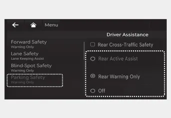 With the engine on, select ‘Driver Assistance → Warning Timing’ from the Settings menu to change the initial warning activation time for Reverse Parking Collision-Avoidance Assist.