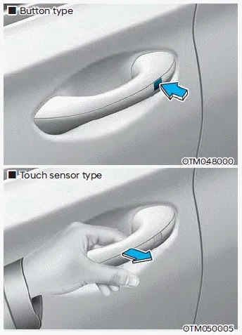 2. Press the Door Unlock button (2) on the smart key, press the button on the front door handle or touch the door unlock sensor inside of the front door handle to unlock the doors.