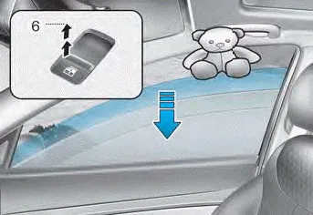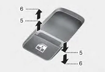 Pressing or pulling up the power window switch momentarily to the second detent position (6) completely lowers or lifts the window even when the switch is released. To stop the window at the desired position while the window is in operation, pull up or press down and release the switch.