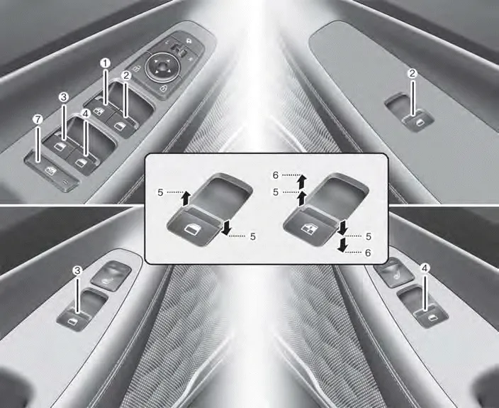 2. Close the window and continue pulling up on the power window switch for at least one second. If the power windows do not operate properly after resetting, have the system be inspected by an authorized HYUNDAI dealer.